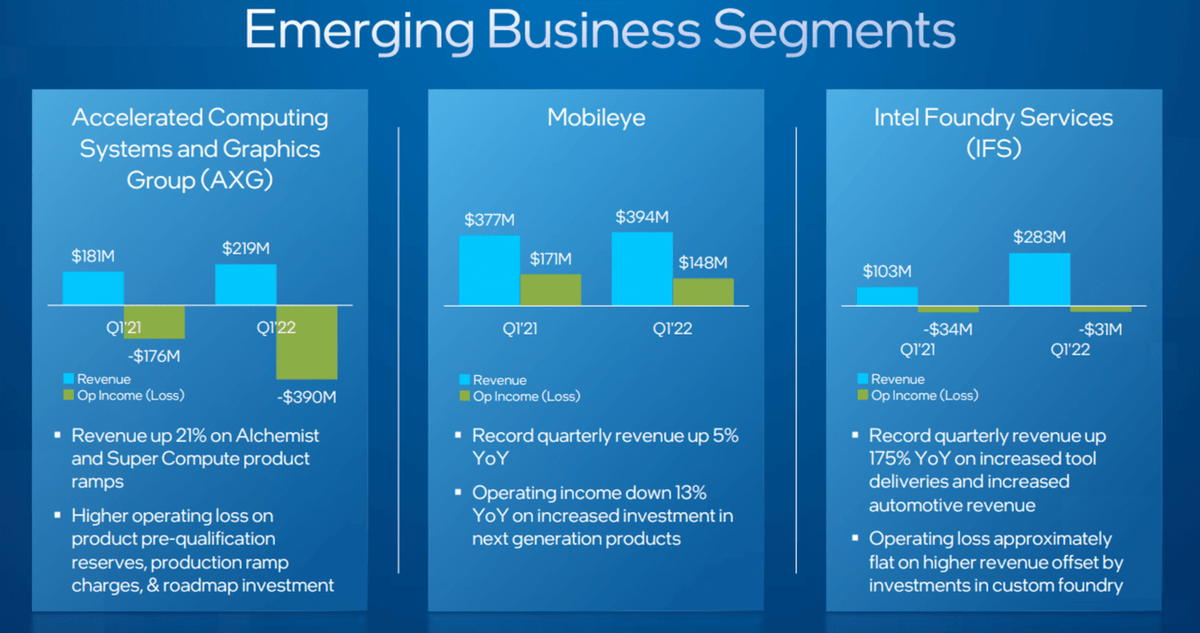 具体来看,英特尔按业务部门划分的公司增长轨迹如下面几张图所示,客户端计算集团是英特尔一直倚仗的部门,然而其增长正在放缓。新兴业务部门集团则显示了英特尔的代工业务,但它到目前为止是占收入比重较低。