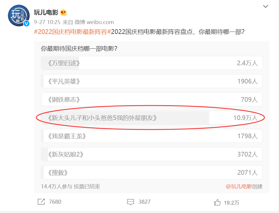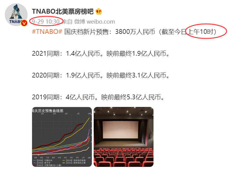 首先看预售,预售是映前观影意愿的直观反映。2019-2021年的国庆档新片总预售数据,对2022年是降维打击。微博#TNABO北美票房榜吧#公布了截至9月29日10时2022年国庆档新片的总预售,只有3800万,分别只有2019-2021年同期的9.5%、20%和27.14%。当天18时27分,2022年的新片总预售才突破5000万,此时距离国庆档正式上映不足6小时,映前最终预售没有破亿。而前三年,分别是5.3亿、3.1亿和1.9亿,至少是今年的2倍。
