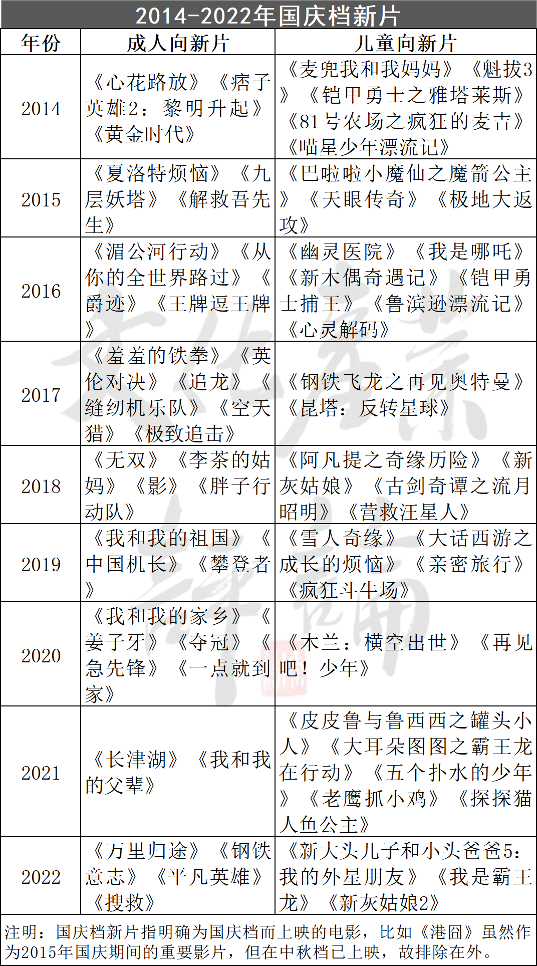 2014年以来,国庆档的新片明显细分为成人向和儿童向,其中成人向电影是档期票房的主力。成人向新片数量最少的是2021年——只有《长津湖》和《我和我的父辈》2部,最多的是2017年,共6部。2022年总共有4部,比2015、2019和2021年都多。