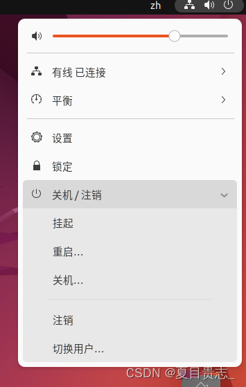 最后注销当前用户(点击屏幕右上角的齿轮,选择注销),返回登陆界面。在登陆界面中选择刚创建的 hadoop 用户进行登陆。
