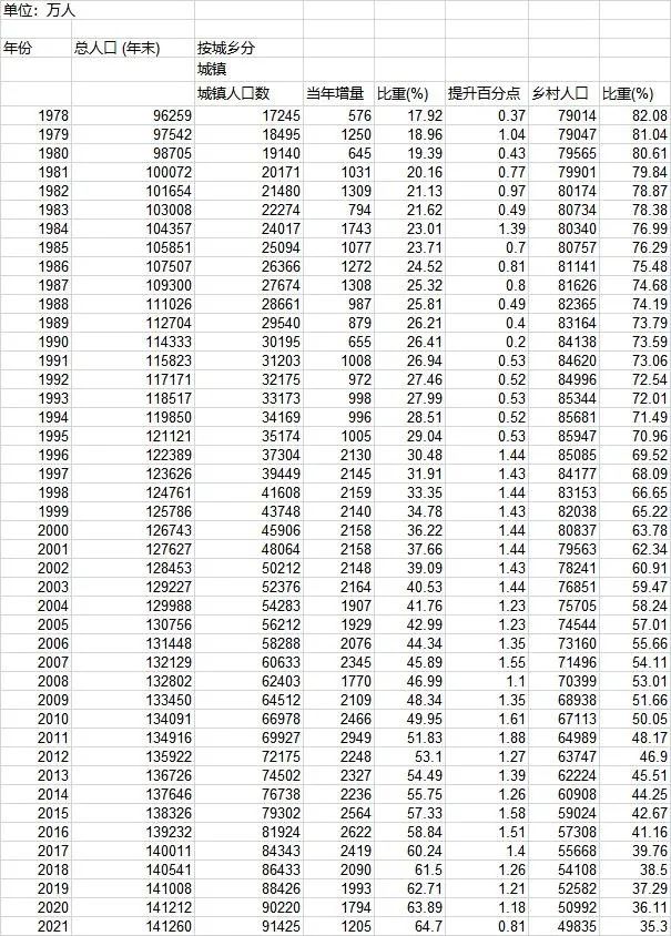 但近年来,随着国内经济发展进入新历史阶段,城镇化进程面临增速换挡。根据《中国统计年鉴2021》与2021年经济社会发展数据梳理发现,2021年我国新增城镇人口1205万人,创下26年来新低。2021年我国城镇化率提升0.81%,提升幅度26年来首次低于1个百分点。另外,中国乡村人口70年来首次低于5亿人。