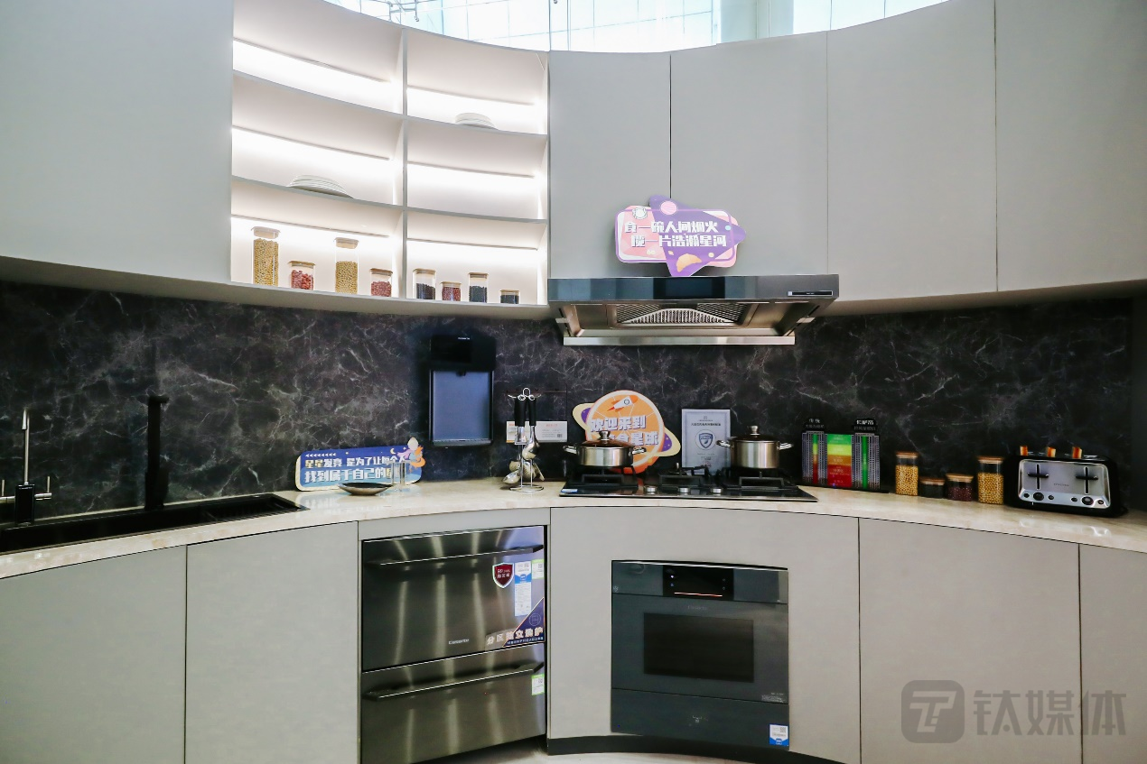 以现场展示的光年套系为例。首先,作为行业首套嵌入式白色厨房套系,通过成套电器实现了外观一致,并且基于智家大脑可以实现冰箱、烤箱、洗碗机等互联实现便捷的烹饪体验,其次,冰箱左右无闪缝,前后齐平,油烟机320毫米深度完全隐入吊柜,抽屉式洗碗机等实现了空间的融合。