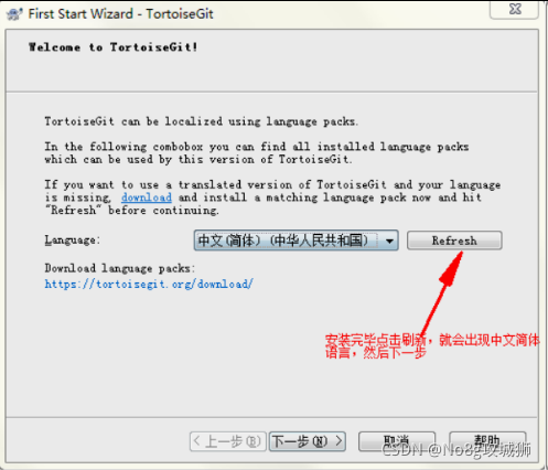 安装顺序:先安装 TortoiseGit 程序包,然后安装语言包(LanguagePack)。安装完毕后,会让选择语言,这个时候可以先把语言汉化包安装完,刷新后出现中文简体语言。