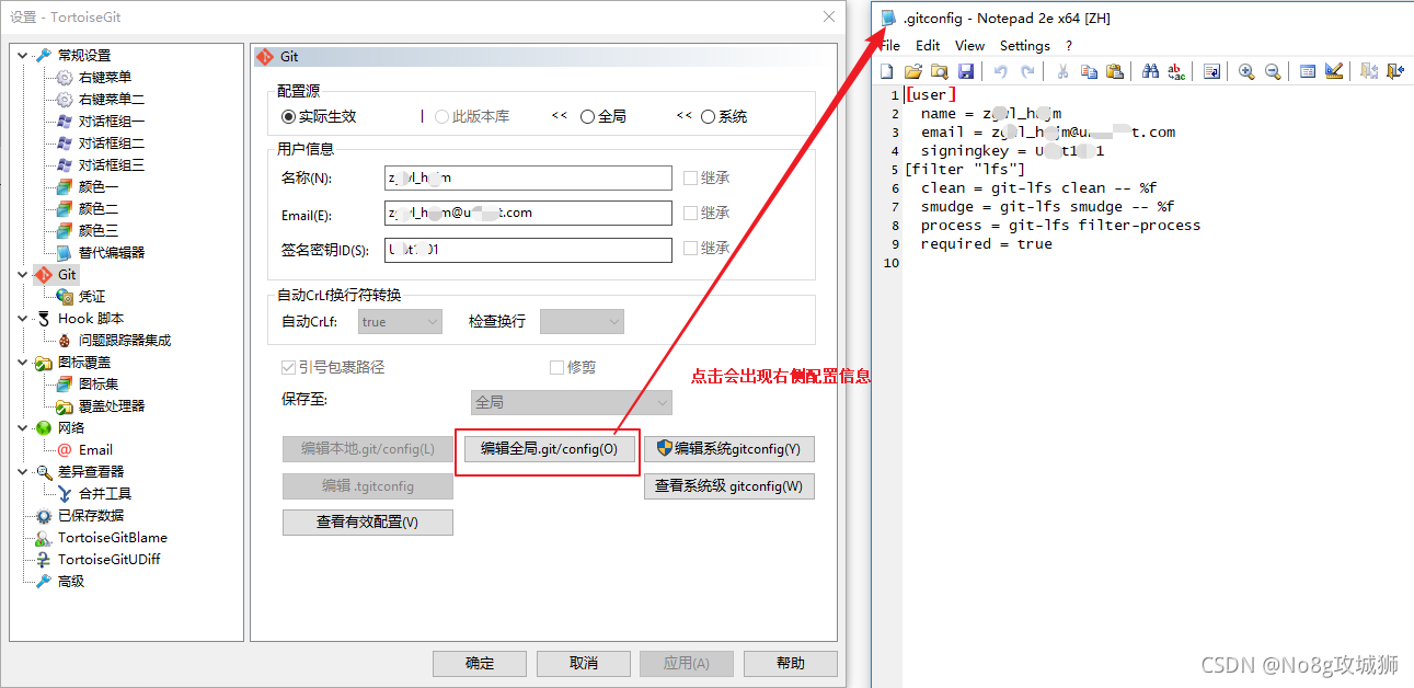 点击 “编辑全局 .git/config(O)”按钮,会使用记事本打开全局配置文件,在全局配置文件中,在后面加上下面的内容: