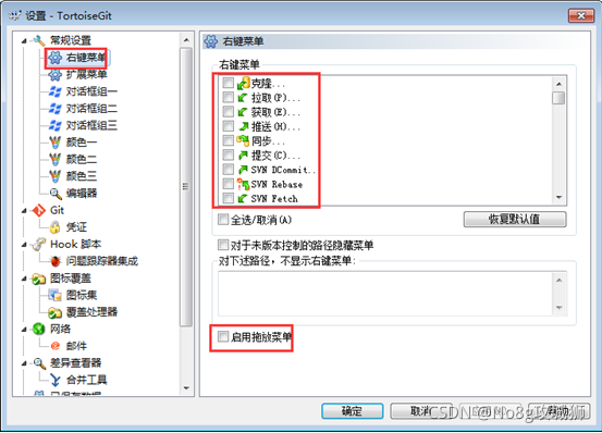 配置右键菜单。在设置对话框中,点选左边的"右键菜单",如果右边的复选框有默认勾选,全部去掉,这样右键菜单显得比较干净。