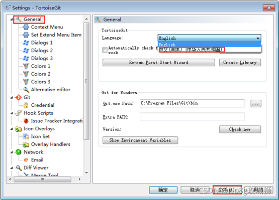 点击General,在页面中选择Language下拉框,选择“中文(简体)中华人名共和国”,然后点击应用,确定关闭对话框(当然也可以继续使用英文)