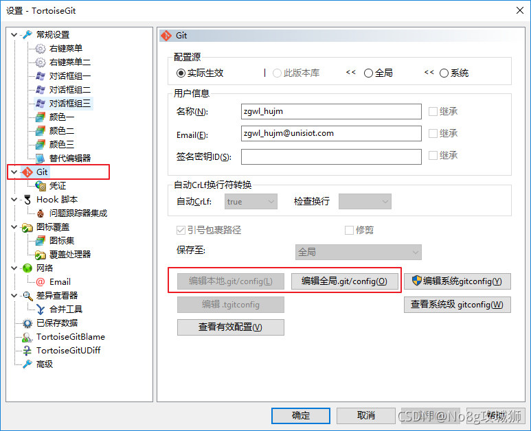 因为当前还没有本地项目,所以 “编辑本地 .git/config(L)” 按钮处于灰色不可用状态,如果在某个本地Git项目下打开配置对话框,那么这个按钮就可用,然后就可以编辑此项目的一些属性。