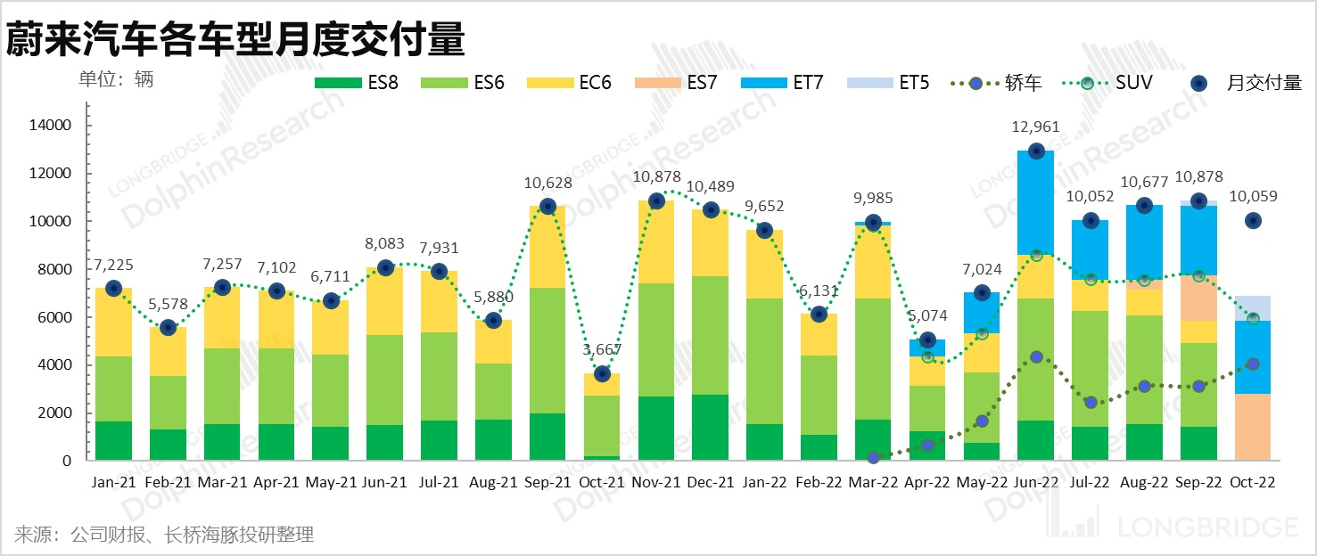 其中,新款轿车 ET7 三月开始交付,整体水花不大,单月销量目前基本停留在三千辆上下;新款 SUV ES7 从八月开始交付了几百辆,到十月接近 3000 辆。