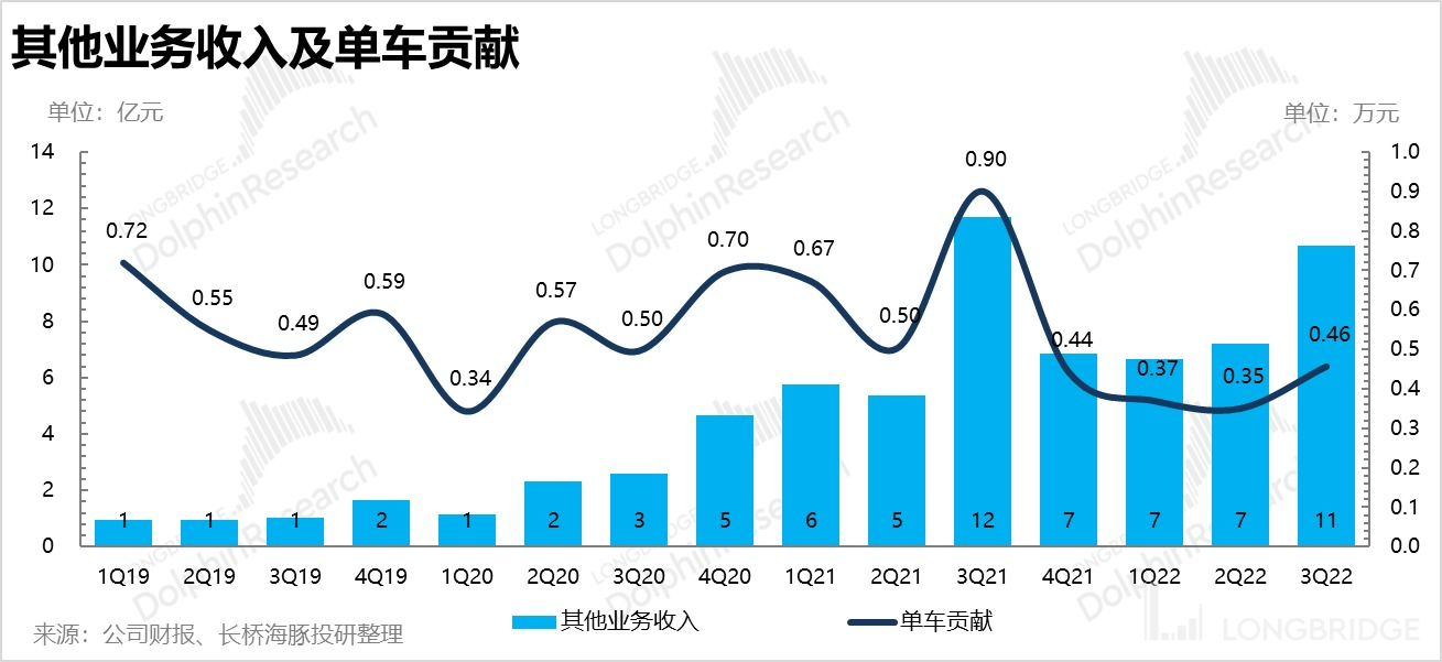 二季度小幅恢复后,三季度毛利率再次有失守的趋势,只有 16.4%。本来走出疫情影响,三季度基本上全部交付涨价后的新订单,市场预期的汽车毛利率高达 17.5%,卖车业务毛利率没有提升,海豚君估可能与新平台车的毛利率还未上来有一定关系。三季度,卖一辆车毛赚 6.2 万,比上季度下滑了 1800 元。