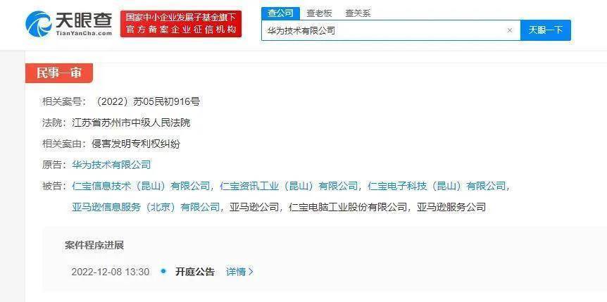 根据天眼查信息显示,华为技术有限公司新增开庭公告,案由为侵害发明专利权纠纷,原告为华为技术有限公司,被告为亚马逊公司、亚马逊服务公司、亚马逊信息服务(北京)有限公司、仁宝资讯工业(昆山)有限公司、仁宝电子科技(昆山)有限公司、仁宝信息技术(昆山)有限公司。