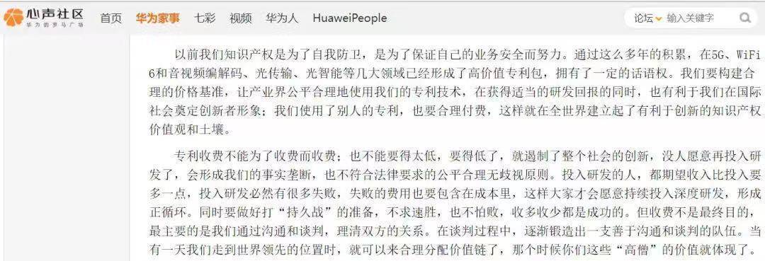华为似乎也在醒悟过来,比如在今年,华为心声社区披露了创始人任正非签发的《专利许可业务汇报》会议纪要,强调在知识产权方面拥有一定话语权后,要构建合理的价格基准,专利收费不能为了收费而收费,也不能要得太低,要得太低就会遏制整个社会的创新。