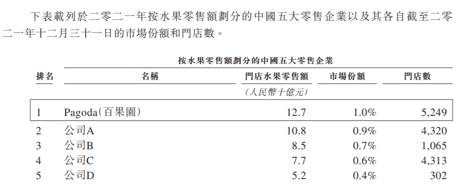 最新的招股书显示,2021年百果园在水果零售行业占据的市场份额为1%,排名第一,是第二名的2.8倍。截至2021年年底,百果园拥有5351家线下门店,分布于全国130多个城市;2021年实现营业收入102.89亿元。