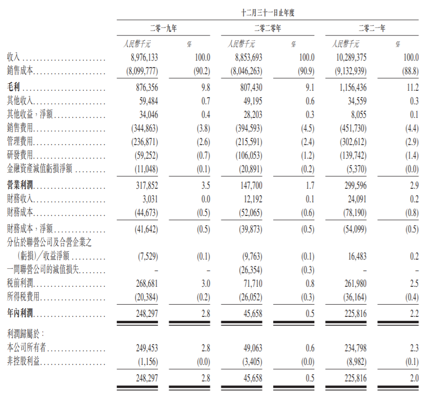 2019-2021年,百果园的毛利分别为8.76亿元、8.07亿元与11.56亿元,毛利率分别为9.8%、9.1%及11.2%。同期,净利润分别为2.49亿元、0.49亿元与2.35亿元,净利润率分别为2.8%、0.5%及2.2%,净利率始终维持在2%-3%之间。