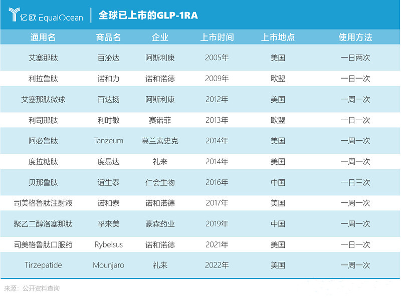 世界上首款GLP-1RA药物是2005年上市的艾塞那肽,这是一种短效药,一天需要注射两次,不过这仍然具有划时代的意义,此后,FDA接连批准了数种GLP-1RA,截至现在,全球已上市11种GLP-1RA。
