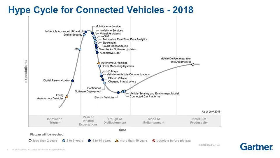 2018年,根据研究咨询机构Gartner的报告显示,自动驾驶汽车正从“过高期望的顶峰”跌落到“幻灭的低谷”。事实上,这是技术发展的必然趋势和良好标志。