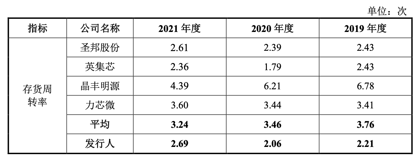 然而,美芯晟的产品竞争力可能不及公司陈述的那么强。从存货周转率中也可见一斑,报告期内,其存货周转率与同行可比公司有一定差距,2019-2021年公司存货周转率分别为 2.21、2.06和2.69,行业均值为3.76、3.46和3.24。