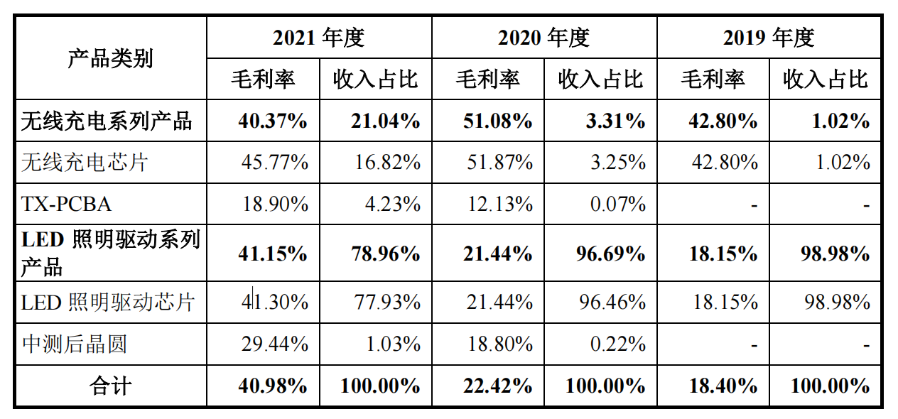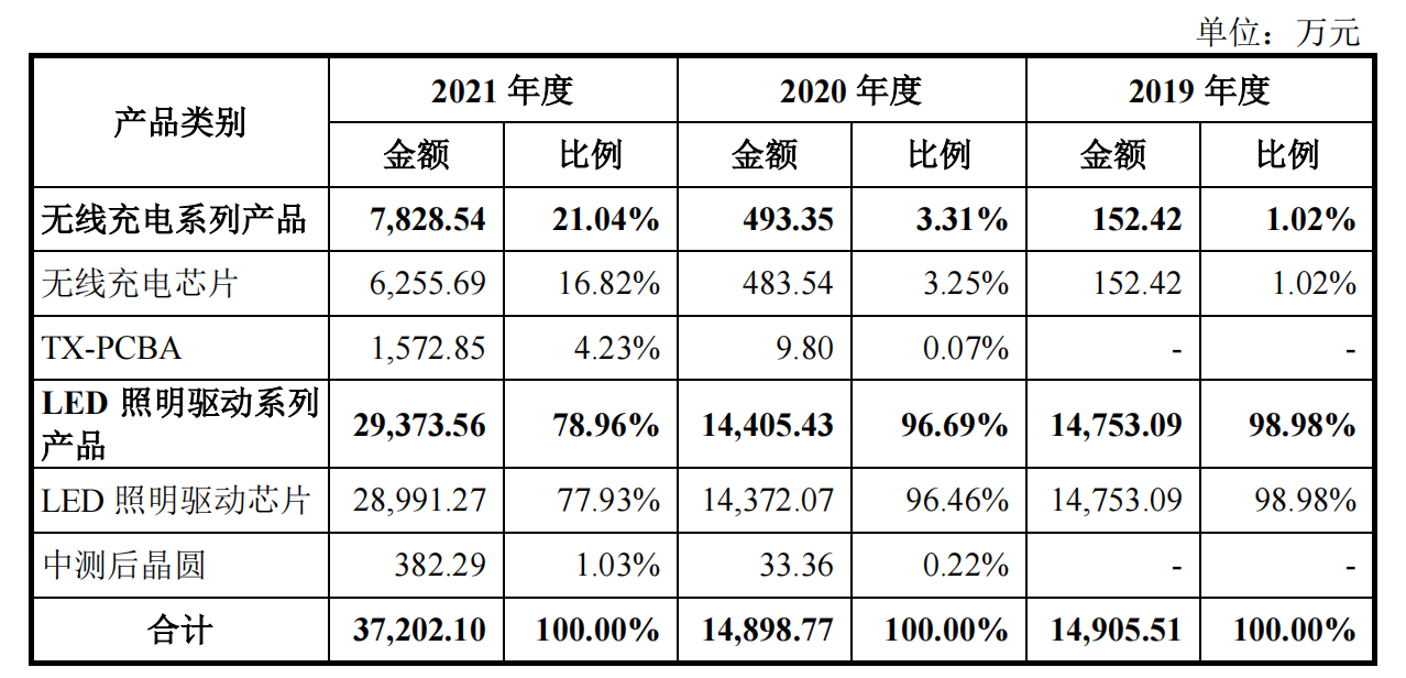 美芯晟是一家Fabless模式的芯片设计企业,主营产品为LED照明驱动系列和无线充电系列两部分,目前LED照明产品收入占比最大,接近80%,不过在2021年之前,此业务占比均在95%以上。