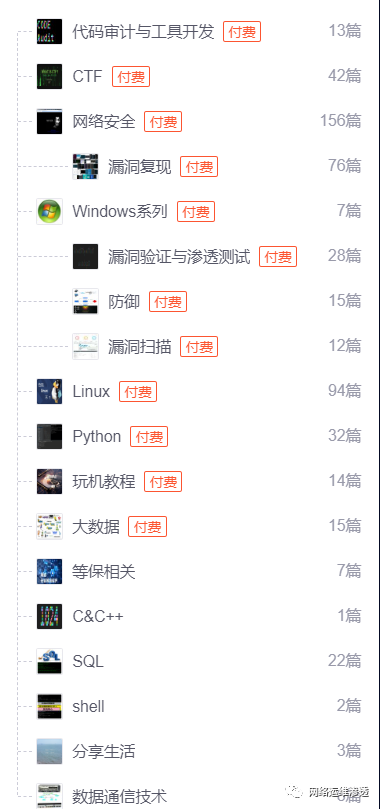 记住,需要写笔记,熟话说:好记性不如烂笔头。特别是干我们这一行,相对来说较杂,而且技术更新迭代快。写笔记、Blog或者公众号都是很好的方式。我喜欢写笔记,一直用的有道云笔记写文章,找工作那会儿,为了能给Boos增加好印象,是不是得有个Blog啊,我懒得搭,也不想维护,于是选择了CSDN写Blog,其实就是我的笔记直接粘贴上去的,那会儿,CSDN还是开源的。后来搞了收费专栏,一开始比例是4:6,作者拿4成,平台抽6成。于是我也开通了,毕竟能有点收入,现在是9:1。我的专栏都是工作中学习总计的技术知识,也反映了我的工作历程。之前搞Linux,发了很多Linux的技术文章;现在搞网络安全,专心写网络安全的技术文章。
