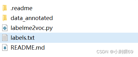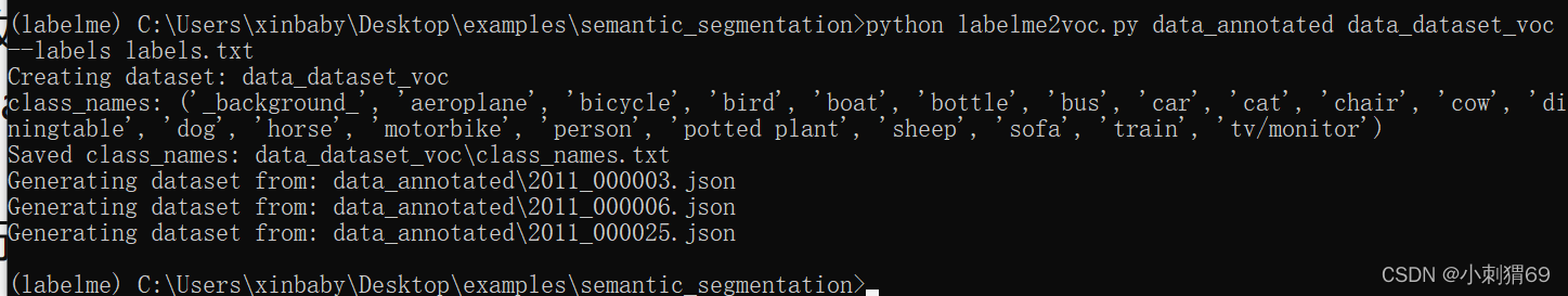 由于标注好的文件是json格式,我们将其转化成图片格式或者其他格式。使用作者给的代码labelme2voc.py。主要转化的格式有: 类名字文件,原始图像的jpeg格式,分割图像的npy格式,png格式, 以及将分割图像叠在原始图像上的jpg格式