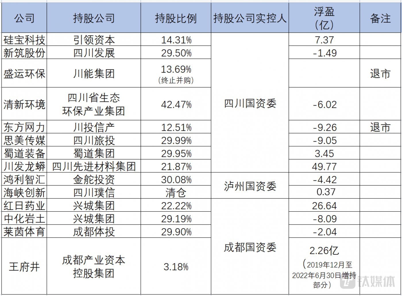 据钛媒体APP统计,四川国资委持股8家上市公司,虽有两家公司退市,但综合浮盈34.77亿,赚得最多;成都国资委持股4家上市公司,综合浮盈18.77亿;泸州国资委持股两家上市公司,综合浮亏5.09亿,亏得最惨。