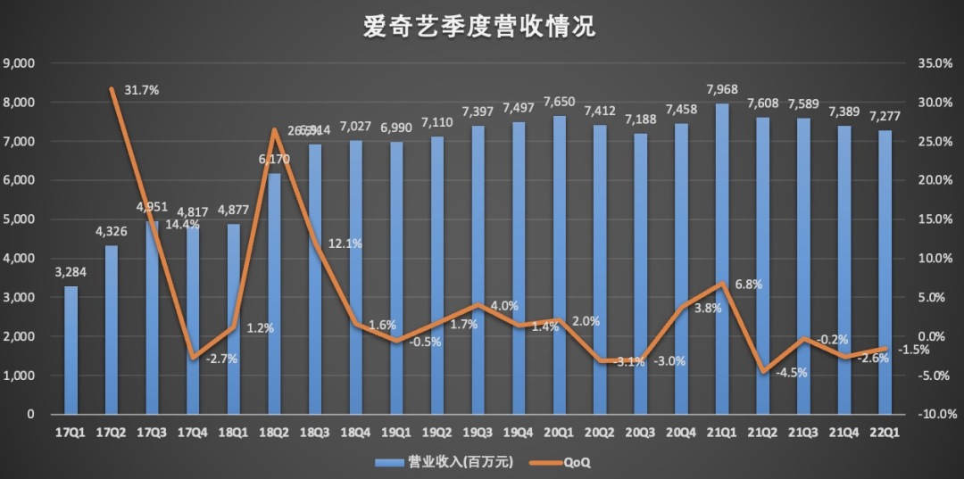 财报显示,一季度爱奇艺实现72.77亿元的营收,超出市场预期的72.2亿元。但是需要注意的是,爱奇艺本季度营收较上年同期的79.68亿元,下降8.7%,较上一季度的73.89亿元,下滑1.5%,爱奇艺季度营收已经连续4个季度环比下降。