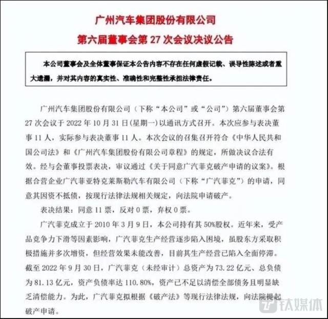 今年 7 月,Stellantis 集团和广汽集团先后发布声明表示,双方正在协商有序终止合资公司。10 月 31 日,广汽菲克在亏损的状态下宣布申请破产清算。