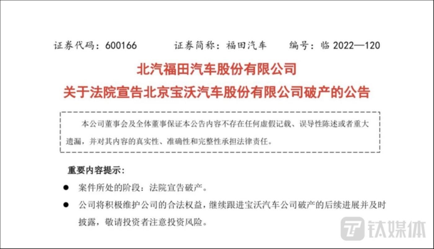 今年 4 月,福田汽车公告,宝沃汽车因财务枯竭,无力清偿到期债务,且资产不足以清偿全部债务,向法院申请破产清算。