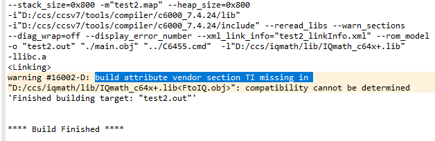注意:出现的警告”build attribute vendor section TI missing in "D:/ccs/iqmath/lib/IQmath_c64x+.lib<FtoIQ.obj>": compatibility cannot be determined“是由于使用的库文件是由一个老版本的编译/链接工具所创建的,在使用新版本的工具进行编译/链接时,这个老的库文件缺失了某些属性,导致了这个警告的产生,这个警告总的来说并不影响程序的运行。详细情况介绍可以参考: