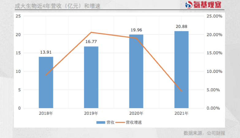 从业绩来看,成大生物的表现并不差,2021年营收达20.88亿元,扣非净利润达8.62亿元。高达41.28%的净利率,恒瑞医药等老牌药企也只能自愧不如。