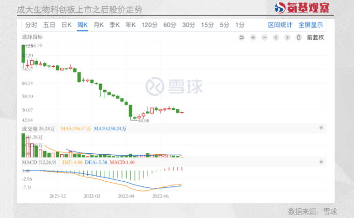 再来看股价方面。“百元成大生物”仅停留在发行阶段,上市后公司股价一路往下,最新收盘价为48.81元/股,这与IPO前停牌价42.17元/股相比,已经没有多少涨幅。