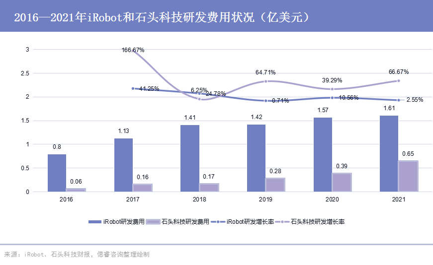 同时,值得关注的是,在iRobot高额的支出中,研发费用增速较缓:2017~2021年,研发费用增长率最高为41.25%,截止2021年,增长率已减少至2.55%,而石头科技这边,近三年增长率一直保持在较高水平。