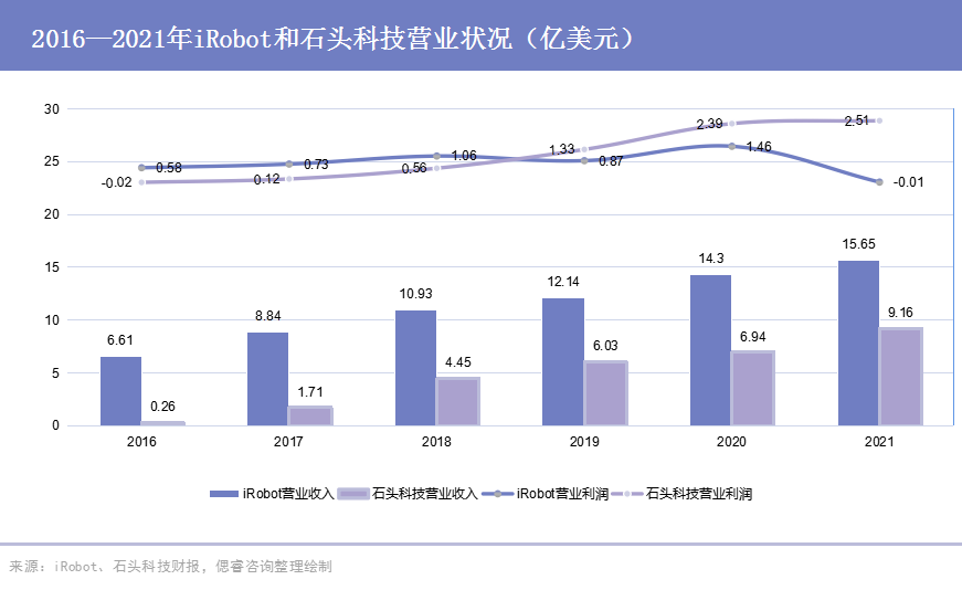 而对比后起之秀石头科技,营收从2016年的0.26亿美元飙升至2021年的9.16亿美元,从营收不足iRobot的5%到58%,增速惊人;营业利润上,从负增收到2.51亿美元营收,利润率高达35.6%。