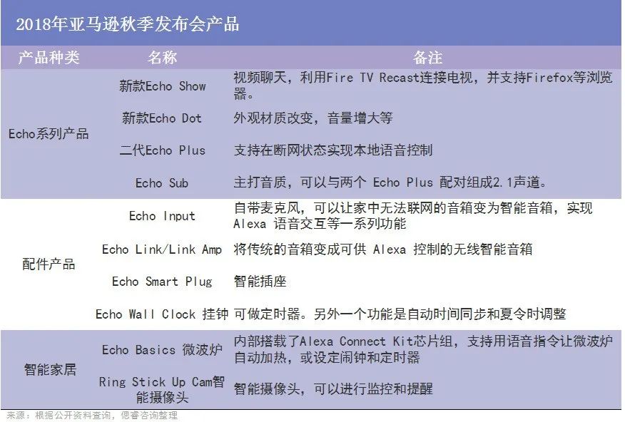 有钱的亚马逊两手都抓:一方面,“买买买”,先后收购了Blink(典型产品:以电池供电的网络摄像头和智能门铃)、Ring(典型产品:配备摄像头的智能Wi-Fi门铃)等一系列智能硬件厂商;另一方面,亲自下场打造硬件单品,如2018年10月的发布会上,亚马逊一口气推出了11件智能硬件,包括4款Echo系列产品、5款配件产品以及2款智能家居产品。
