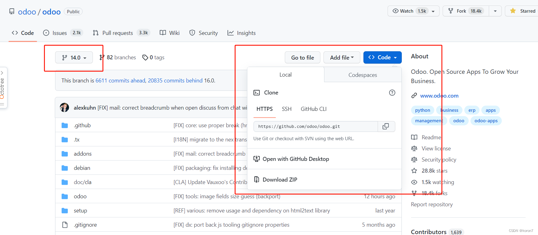这边是建议先用14,据我了解的几家国内的做odoo的公司大部分都用14,14在国内经验积累也多一点,但后续他们会转到16,16也是同理的。我这边网络很差我一般不直接克隆,而是下载到本地,使用这个是最稳妥的。所以你得选右边红框最后一个zip包。