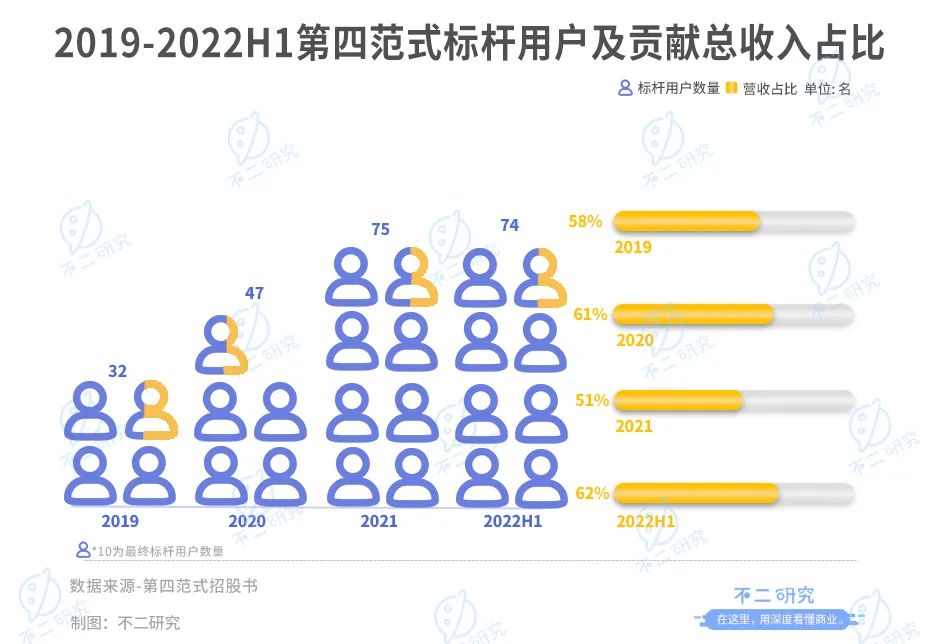 同期,第四范式分別服务32名、47名、75名及74名标杆用戶;标杆用户收入分別贡献总收入的58%、61%、51%及62%。三年半内,标杆用户的营收占比过半。