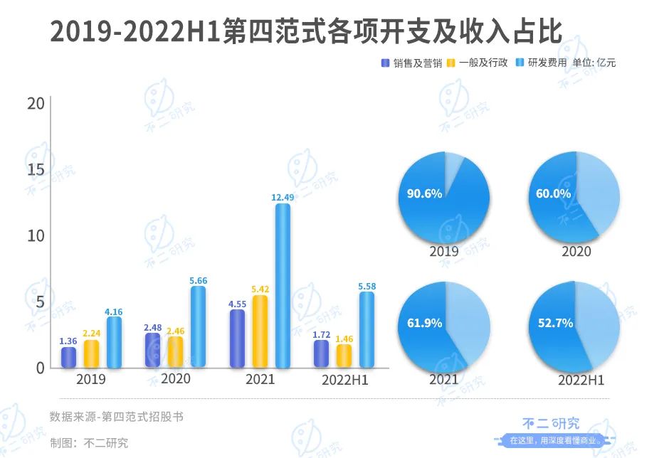 在2019年、2020年、2021年及2022上半年,销售及营销开支分别为1.36亿、2.48亿、4.55亿、1.72亿;一般及行政开支分别为2.24亿、2.46亿、5.42亿、1.46亿。