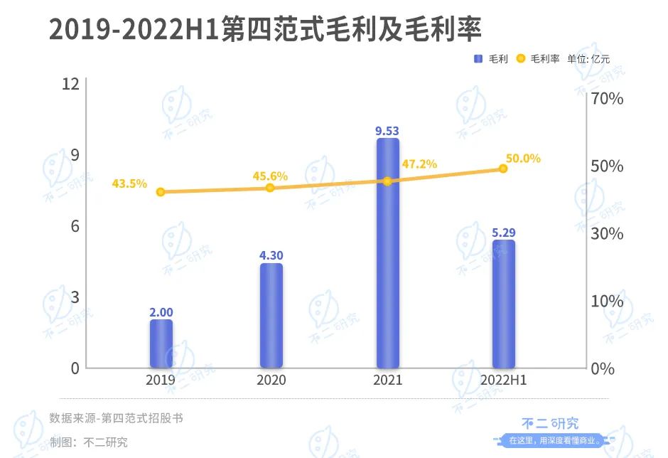 2019年-2022上半年,其营收分别为4.60亿、9.42亿、20.18亿、10.58亿;同期的毛利分别为2.00亿、4.30亿、9.53亿、5.29亿。