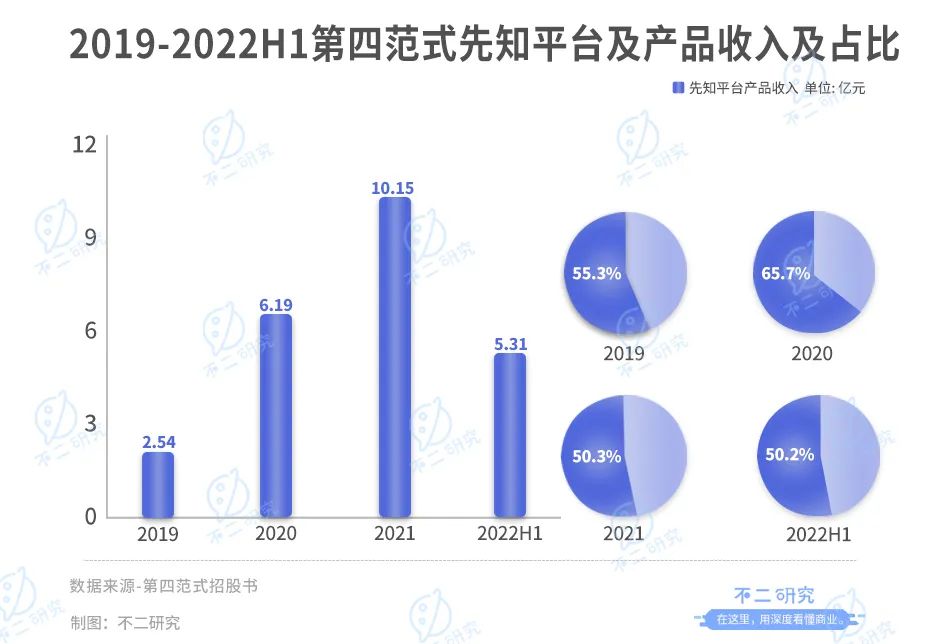 2019年-2021年以及2022上半年,其先知平台及产品收入分别为分别为2.54亿、6.19亿、10.15亿和5.31亿,占总收入的55.3%、65.7%、50.3%和50.2%。