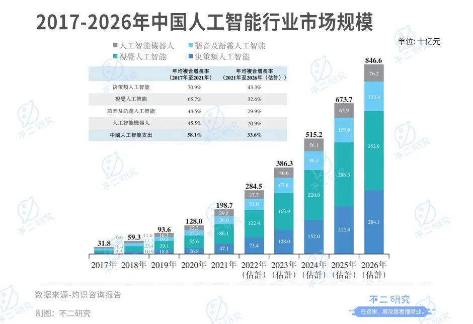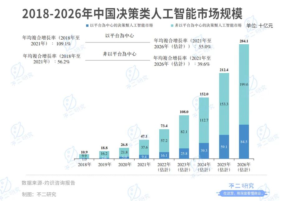 灼识咨询报告显示,2020年,中国决策类人工智能市场的支出规达到268亿元,预计2026年将增长至2841亿元,年均复合增长率为47.1%;高于视觉类、语音类和机器人的年复合增长率预期,后三者分别为36.4%、33.2%和23.8%。