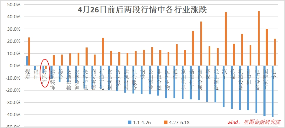 结合两段行情来看,前期下跌越多,后期反弹力度越大,而银行和地产前期下跌有限,故而在4月27日以来的反弹行情中不涨反跌。其中,只有煤炭板块是个例外,前后两段均实现绝对正收益。