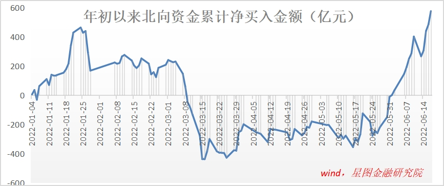 自5月17日开始,北向资金一改前期净流出趋势,开始净流入A股市场,期间累计净买入930亿元。进入6月份以来,在中美基本面相向而行的背景下,美国市场开始交易滞胀和衰退,美股快速下跌;A股市场则开始交易底部反转和经济复苏,指数快速反弹,相对吸引力上升,全球资金正加速增配A股市场。