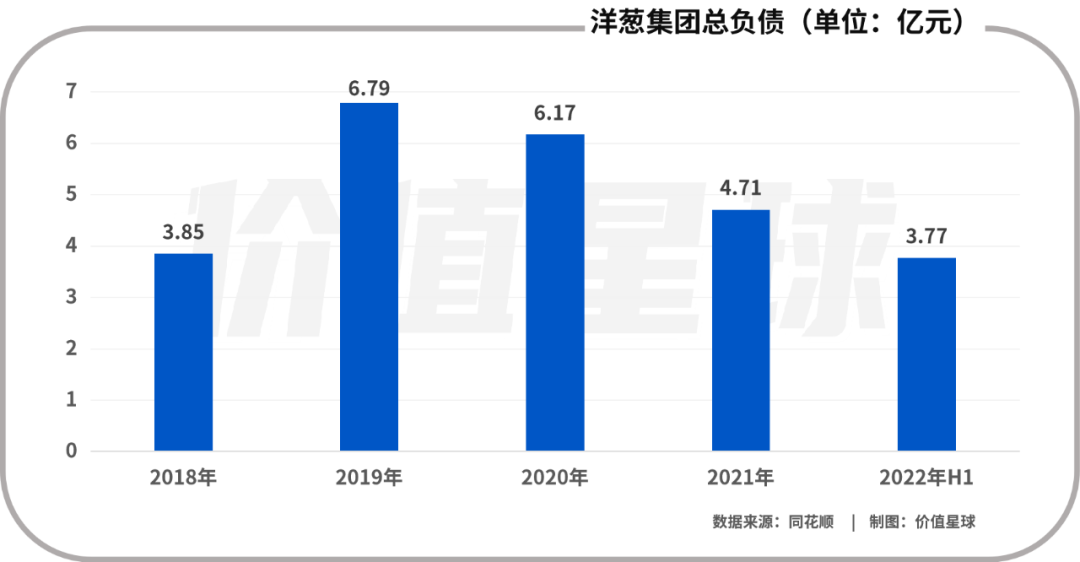 其实经营业绩下滑早有伏笔,2021年洋葱集团经营活动产生的现金流净收入为-3.56亿,同比增速-269.9%,销售及管理费用却大涨到9.02亿元,同比大涨69.19%。“出多进少”的情况直接推高公司负债,2021年公司总负债4.71亿元。到2022年H1,负债略有下降,但仍高达3.77亿元。