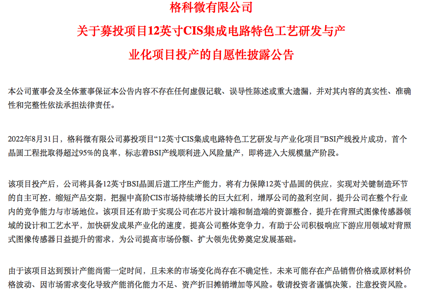 格科微公示募投项目进展,截图自公告