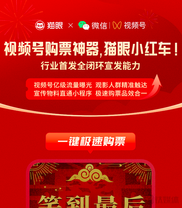 钛媒体APP独家从知情人士处获悉,国内票务平台巨头猫眼与微信的合作将进一步深入,实现微信视频号行业首个全闭环宣发,与视频号联动开放了短视频一键购票功能,在实现观影人群实现精准触达的同时,助力影片达成宣传物料亿级曝光,并实现视频直通小程序,缩短用户从兴趣到购票的链路。