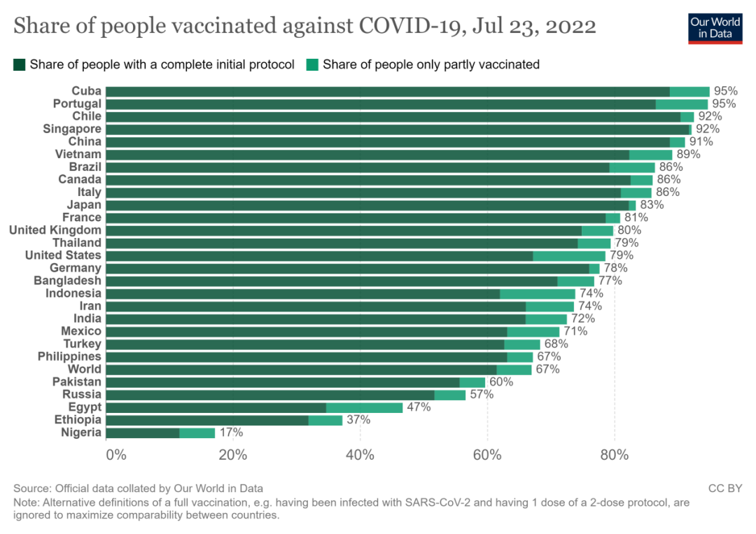 纵观全球市场,拥有较强支付能力的国家基本已经在2022年之前完成了新冠疫苗的主要接种工作。具体来看,截至今年6月20日,全球已经有66.3%的人口至少完成了1剂新冠疫苗的接种,古巴、智利、新加坡等国家的集中率更是超过90%。
