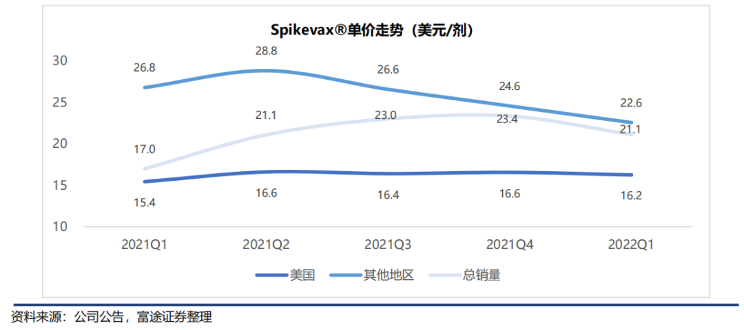 迫于市场萎缩的严峻形势,行业龙头Moderna也开始下调旗下新冠疫苗Spikevax在全球的售价,单剂价格从28.8美元一路降至22.6美元,但这并没有阻挡疫苗出货量的下滑。2022年Q1季度,Spikevax的出货量已经下降至2021年Q2季度的水平,环比下降9.8%。