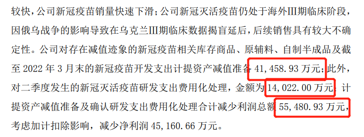 对于业绩下降,康泰生物管理层直言不讳的给出解释,由于新冠灭活疫苗管线存在减值迹象,因此公司对新冠疫苗相关库存商品、原辅料、自制半成品、开发支出进行计提,合计计提资产减值准备5.55亿元。