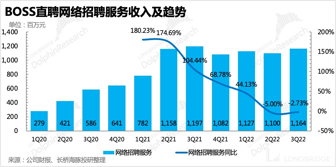劳动力市场的求人倍率是招牌平台收入的最直接晴雨表。猝不及防的三年抗疫和网安审查,打破了 BOSS 直聘高增长态势。虽然三季度收入下滑有所缓解,但仍然未呈现显著的复苏反弹迹象,至少在三季度,企业的招聘意愿是极其低迷的。