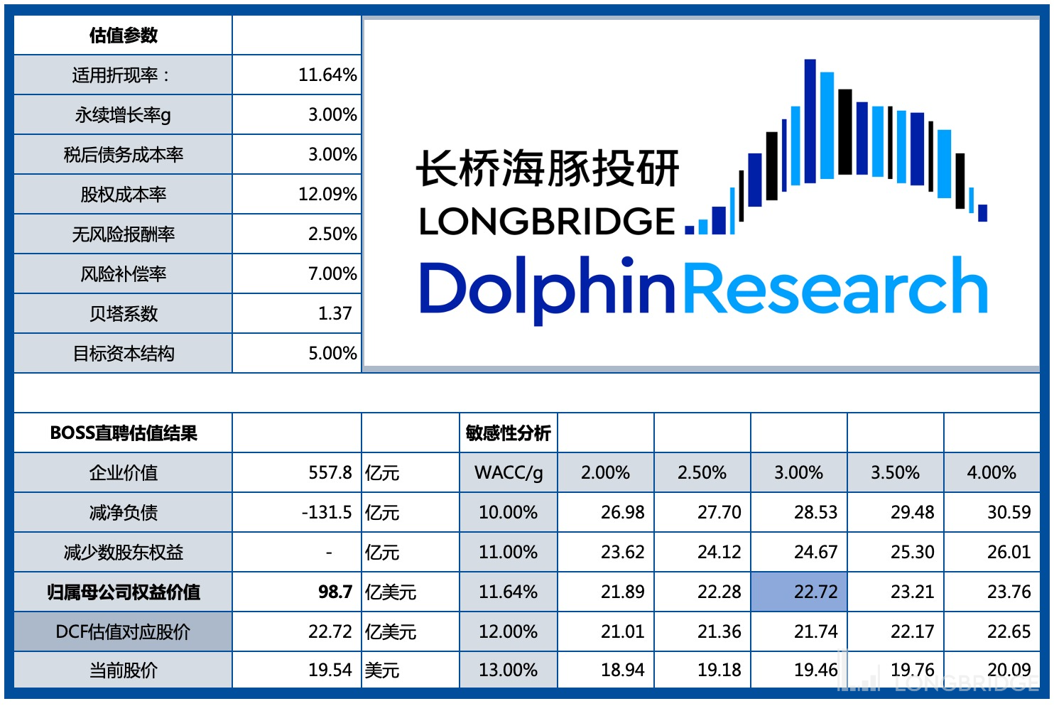 (7)按照 WACC=11.64%,g=3% 的假设,DCF 估值结果为 22.7 美元/股,对应 2024 年的净利润,隐含 PE 45x。而 2023 年~2026 年净利润 CAGR=44.6%,即基本对应 PEG=1 的假设。