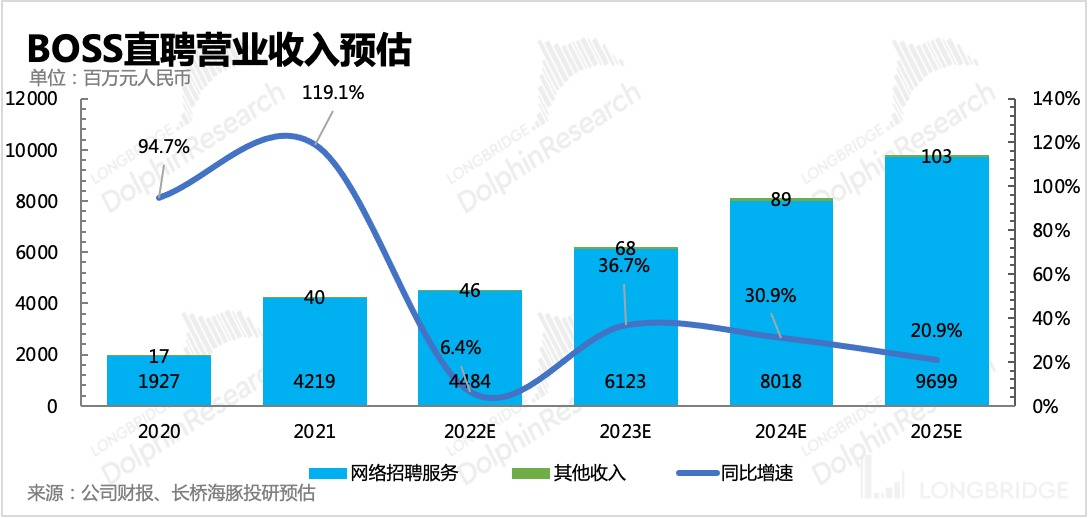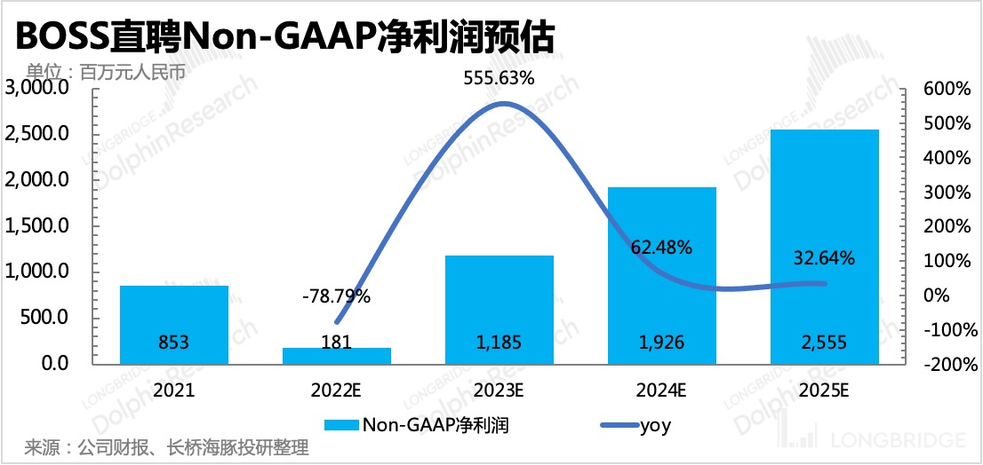 中小企业招聘需求增加 + 线上化加速渗透 + 直聊,这三个逻辑都指向了$BOSS 直聘.US 。虽然线上招聘这个高增长高毛利的赛道又迎来一些新选手涌入,但通过复盘近一年 BOSS 直聘在监管与宏观 “双压” 之下的发展情况,海豚君认为 BOSS 直聘除了在特定行业(如互联网)、企业类型(中小企业)中对同行存在碾压性优势之外,对于其他细分领域,其算法能力依旧有望复刻经验并产生优势,只是时间长短和用户迁移成本性价比的问题。